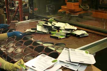 I also learned that these Ali boys are a resourceful lot. Frank and his sons literally designed and built, the colossus of a machine that manufactures their Gator Finishing Products. They call it, ominously, “The Maker,” and it has to be at least a football field long. If you’ve ever seen a continuous-feed web printing press in operation, you’d get the gist of how “The Maker” churns out sandpaper. Giant rolls of substrate, which can be either paper or cloth, feed into one end of the machine. It applies resin and a layer of grit (technically called grains), bakes it one or more times depending on the product, and then rolls up the completed bulk sandpaper on the other end. An electrostatic charge draws the grains up onto the glue-wetted substrate like a magnet. Unlike a gravity-based process, which would lay down the grains more or less randomly, a static current ensures that the largest flat facets of the grains end up glued to the paper. That way, their pointed tips face out. It’s an important detail that improves the abrasive longevity and performance.