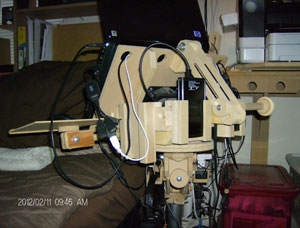 Robert ended up adding an I-beam trolley on slides to the top of the bed. After building it, he moved his “underbed” plastic storage boxes to the top of the structure. Also attached are the computer and TV stand that allow him to sit on the bed and eat while watching TV, or to push it the other way, and to have the computer available whether he’s lying down orsitting up.